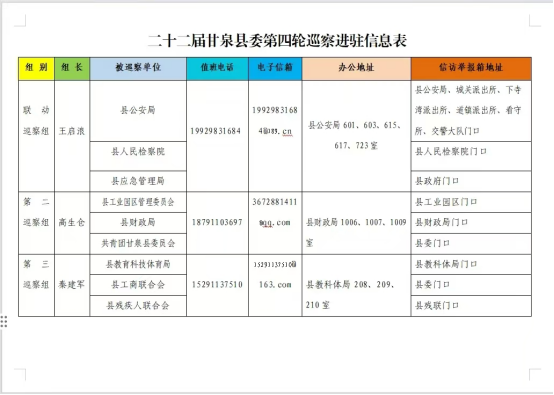 为便于干部群众反映问题,现将二十二届甘泉县委第四轮巡察进驻信息公布如下: