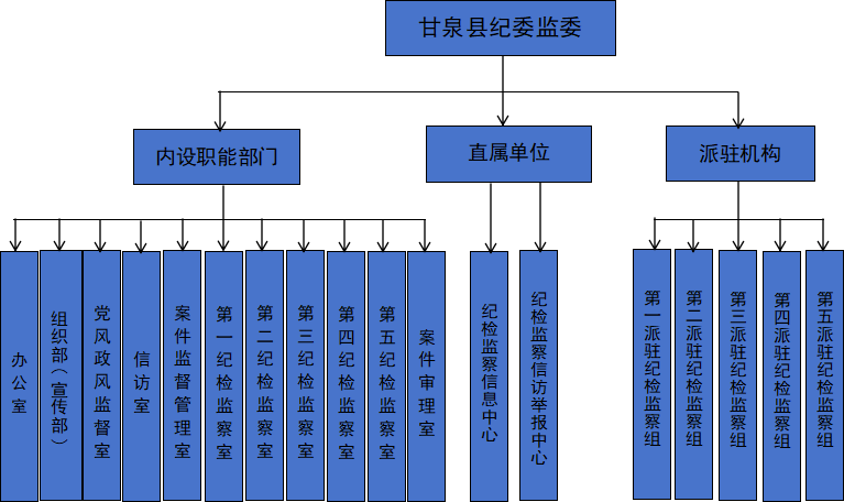 中共甘泉县纪律检查委员会甘泉县监察委员会组织机构包括:内设职能部门、直属单位和派驻机构。内设职能部门具体为:办公室、组织部(宣传部)、党风政风监督室、信访室、案件监督管理室、第一至第五纪检监察室、案件审理室。县委巡察工作领导小组办公室列入县委工作部门序列,设在县纪委。 此外,设有甘泉县纪检监察信息中心、甘泉县纪检监察信访举报中心2个直属单位;设有县纪委监委派驻纪检监察组。